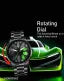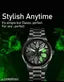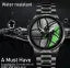 This image shows a men's wristwatch with a distinctive car wheel-inspired dial. The watch features a black metal case and band, providing a sleek and modern look. The dial mimics the design of a car wheel rim, showcasing a multi-spoke pattern and a central hub. A prominent feature is the bright green brake caliper detail visible behind the spokes, adding a pop of color and a sporty aesthetic. The watch hands are also green, complementing the brake caliper and enhancing the overall visual impact. The watch is presented against a plain white background, allowing the design details to stand out clearly.